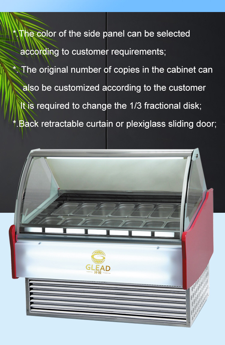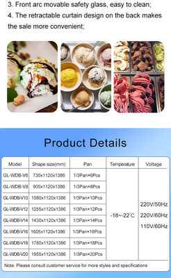 La vitrine de la crème glacée est un ajout parfait à votre entreprise. Elle fournit non seulement la réfrigération nécessaire mais améliore également l'esthétique de votre espace.La vitrine est conçue pour être élégante et moderne.Il est également facile à nettoyer et à entretenir, ce qui garantit que votre entreprise reste hygiénique et propre.